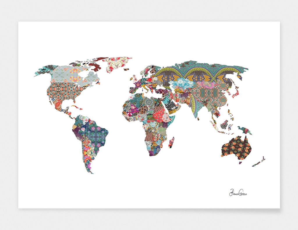 A world map designed by Bianca Green for use on various prints and home products for Urban Outfitters and Society6, showing a typical political boundary map shaded with vivid print patterns.