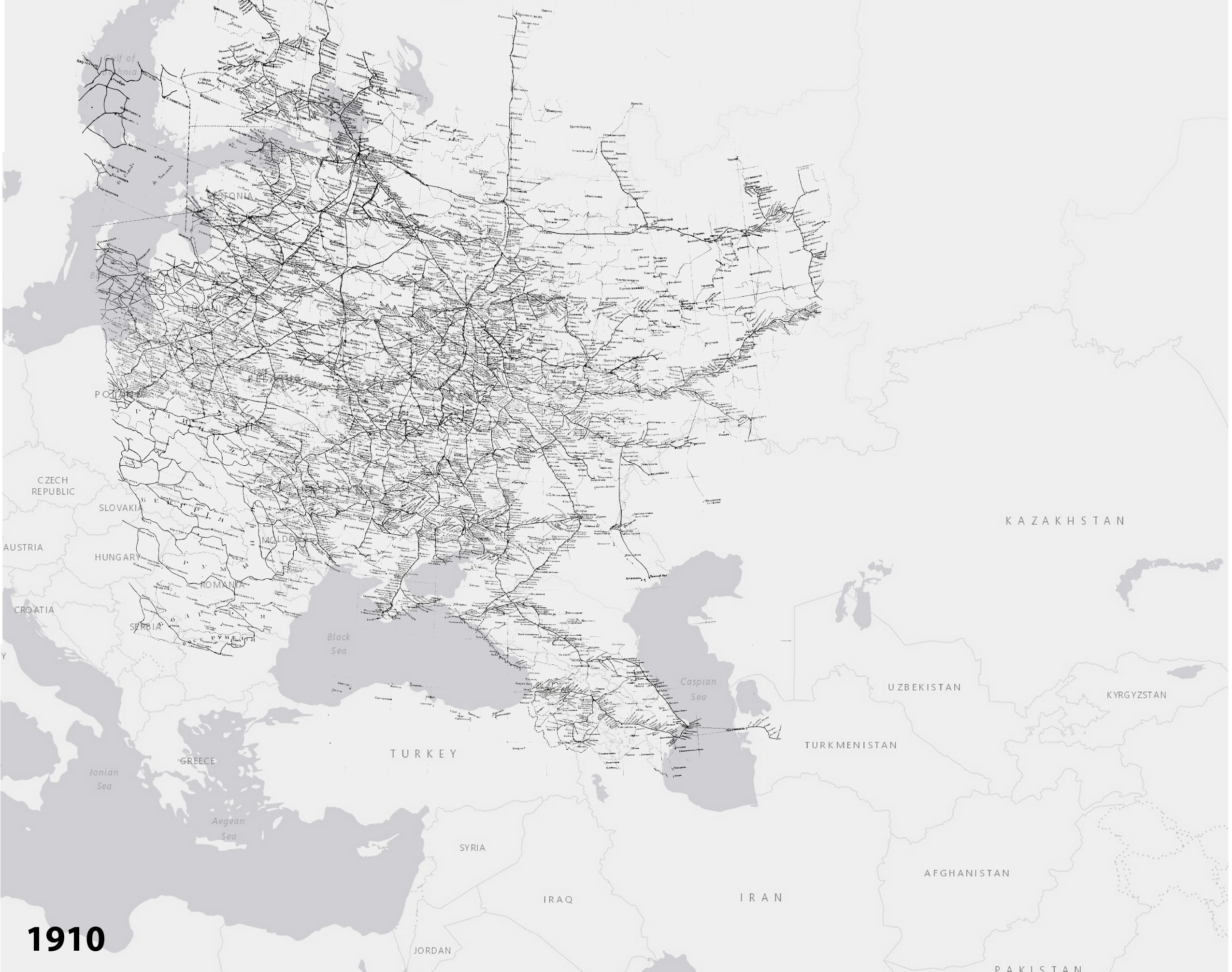 This map features just the railroad network as produced in a map of the Russian Empire from 1910.