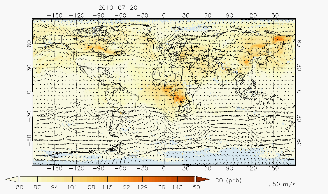 Data retrievals from the Atmospheric Infrared Sounder (AIRS) instrument on NASA's Aqua satellite. The gif depicts trace concentrations of carbon monoxide in the air at the time of the wildfires in Russia. The cloud of CO from the fires started over European Russia and stayed for a month, stretching over Russia into China.