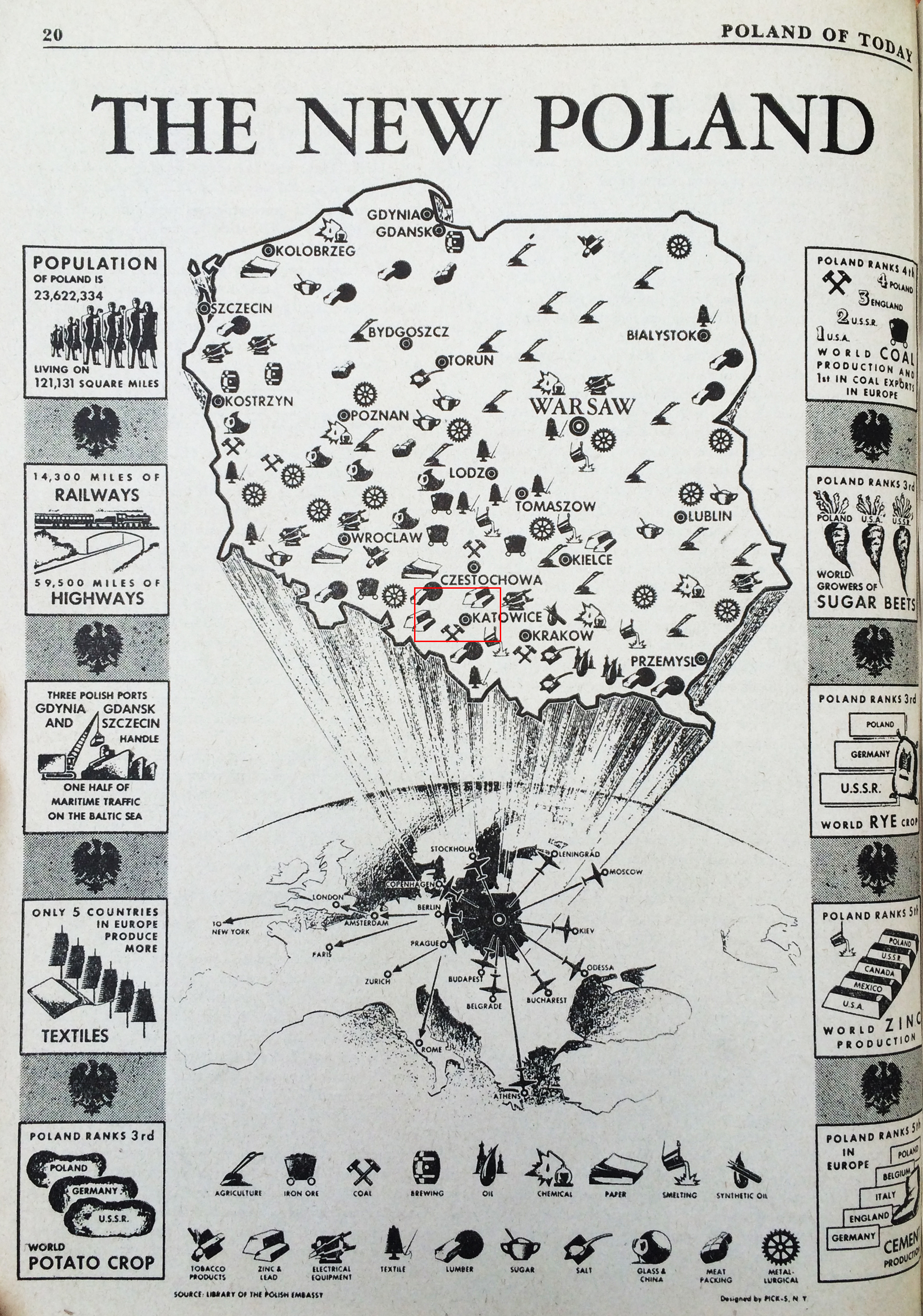 Designed by Pick S. of New York for the Library of the Polish Embassy. Besides illustrating, graphically, where various Polish industries are located and the destinations of Polish exports, various statistics about Poland demographics and how Polish economic and production power ranks relative to other countries is shown.