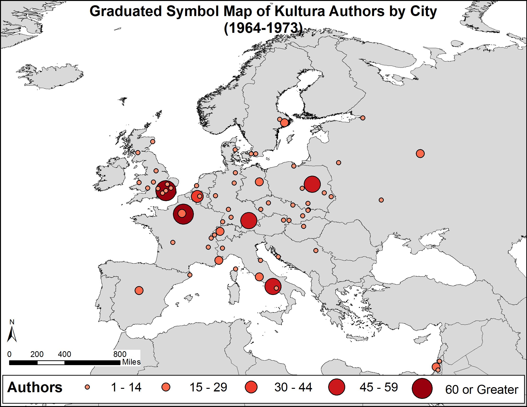This map shows the locations of the authors in Europe contributing the Polish emigre journal Kultura between 1947 and 1989.