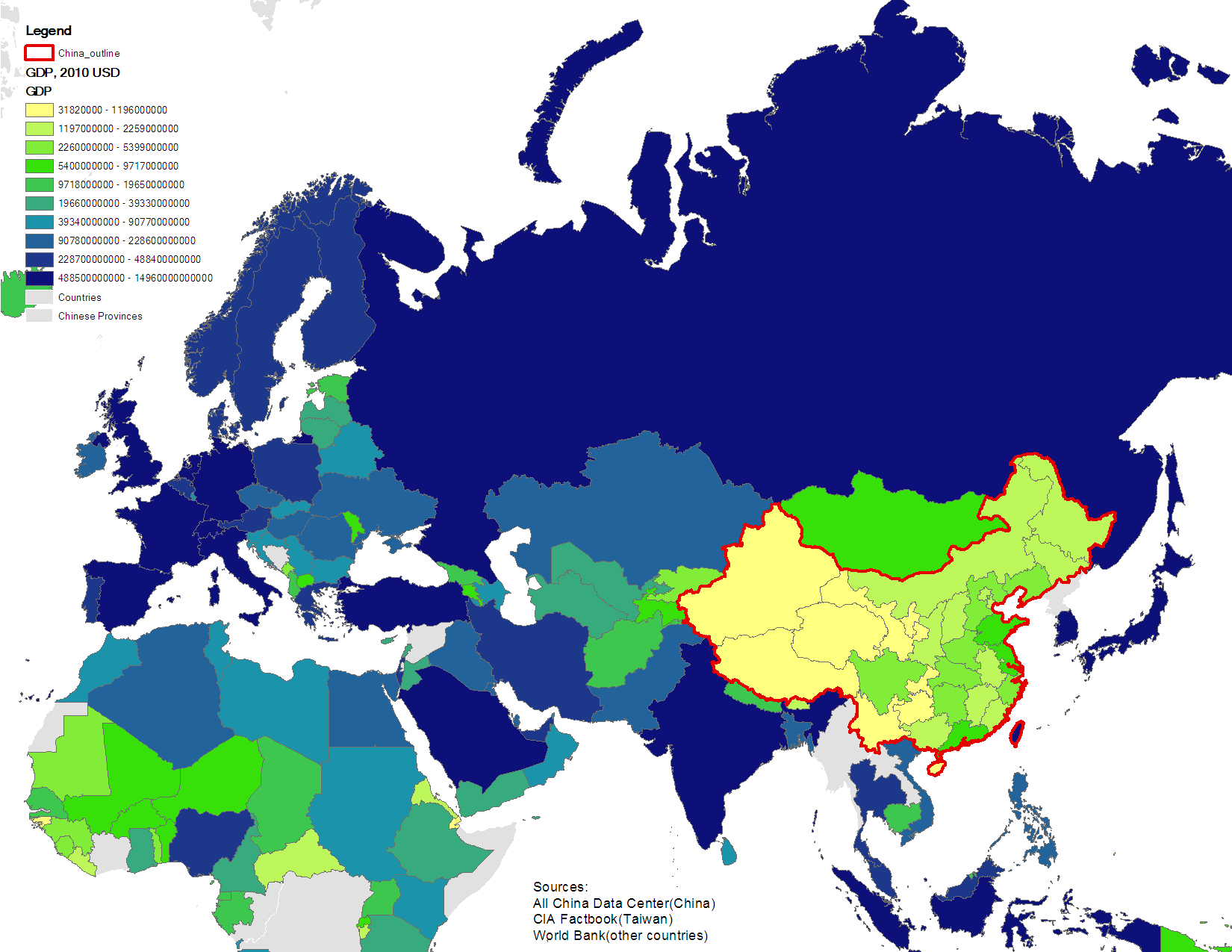 I visualized the series of (population density, GDP, GDP per capita, FDI) on a map that juxtaposes provinces of China and other countries in the Silk Road region, so they are in a sense more comparable in scale. Data sources includes World Bank database, CIA factbook and the All China Data Center.