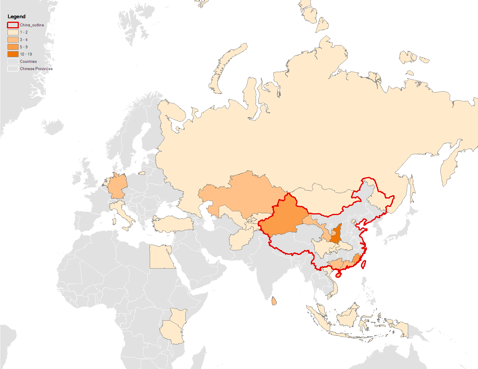 I geocoded the Xinhua.net news archives of the Silk Road Economic Belt and 21st Century Maritime Silk Road feature page (http://www.xinhuanet.com/english/special/silkroad/, available in Chinese, English and Russian), and mapped them in ArcGIS. Note that the map includes all Chinese provinces and countries for other parts of the Silk Road region.