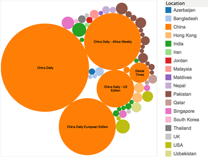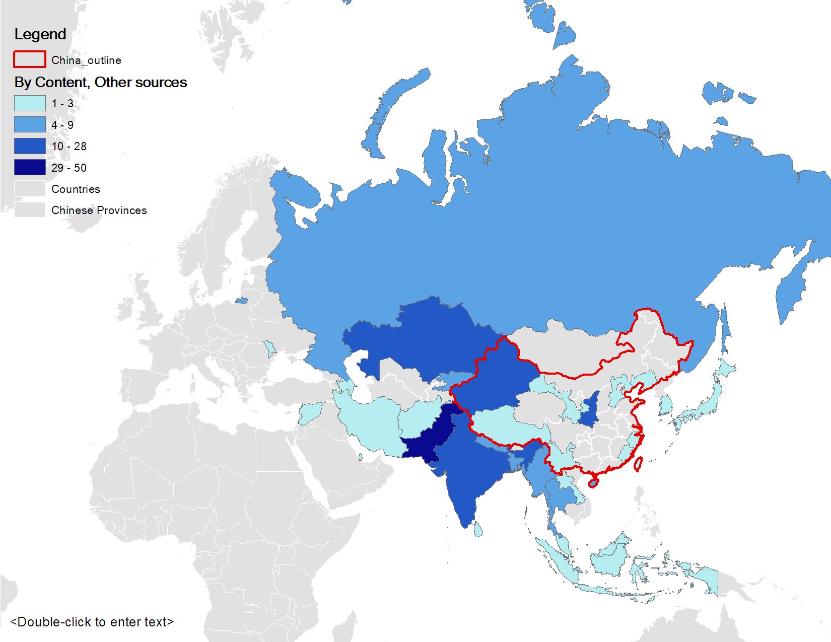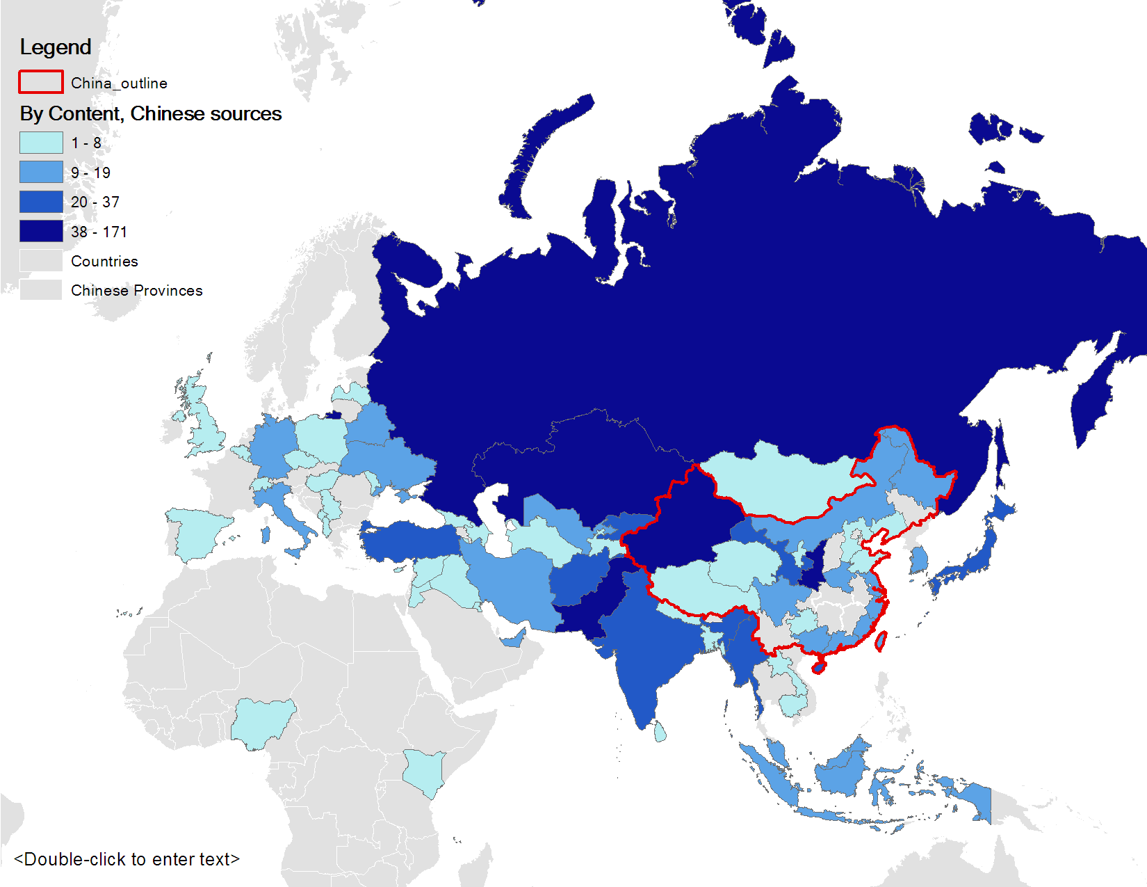 I mapped all the news search result of Silk Road Economic Belt from LexisNexis academic news database, according to the geography analyzed by SmartIndexing of the site. The two maps are those of Chinese state-owned news agencies and other international sources respectively. Note: the map includes all Chinese provinces and countries for other parts of the Silk Road region.