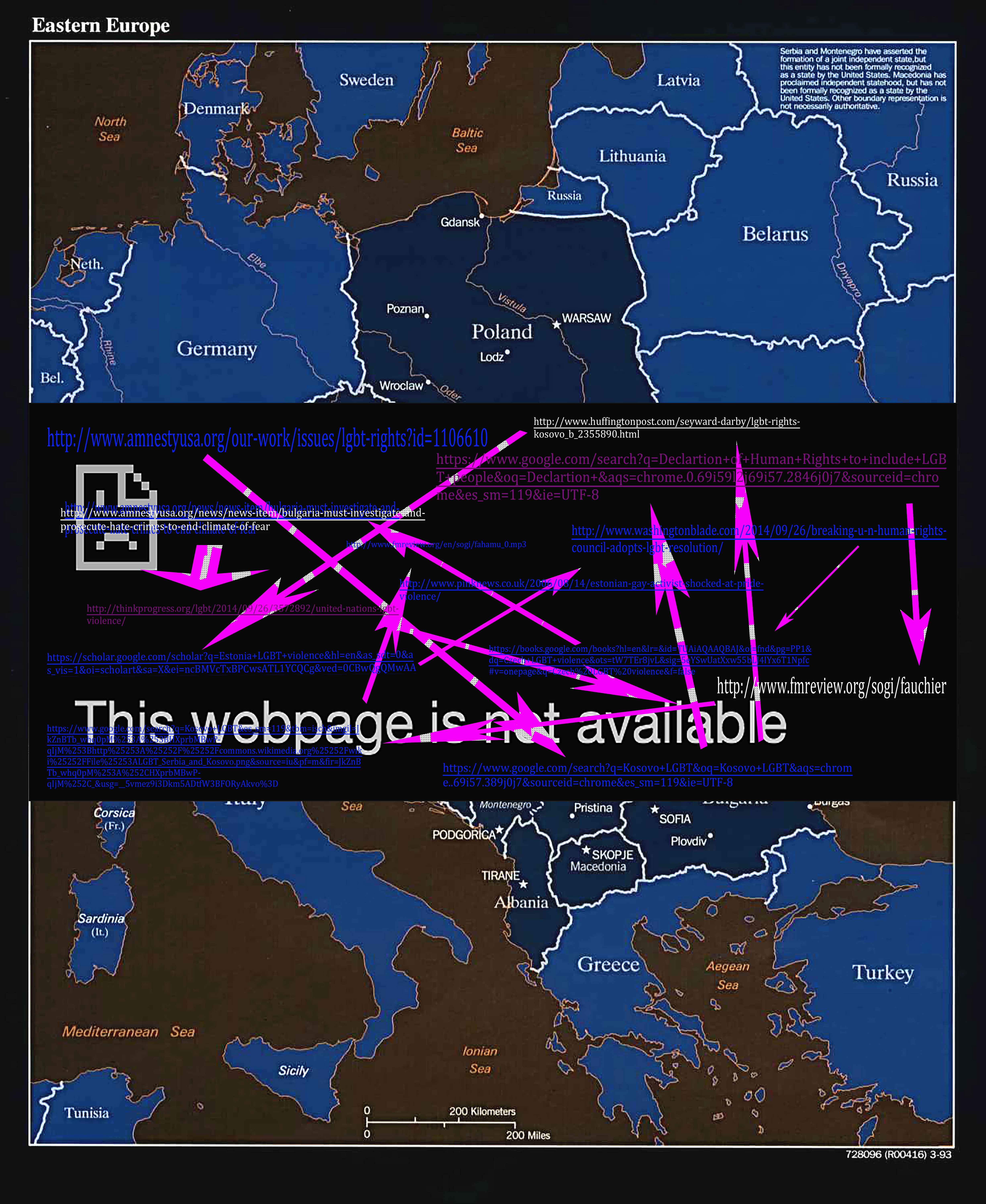 This diagram is the data companion to the video 'EUs Pardoning of Violence Related to the LGBT Community'. This diagram demonstrates one particular path you can take when navigating the internet to conduct research. Each URL acts as a coordinates in the same way we use Global Positioning Services(GPS) to establish points on a map. What has intrigued me and propelled me to develop this and other diagrams in this collection has been the different paths you can take while researching any topic online. Each link becomes a gate, opening up new portals of information and can surprisingly draw lines between topics who's connections are not apparent. Below I have included the links for you to create your own path, further explore the content and to become more familiar with LGBT Social Movements presently happening in Eastern Europe.